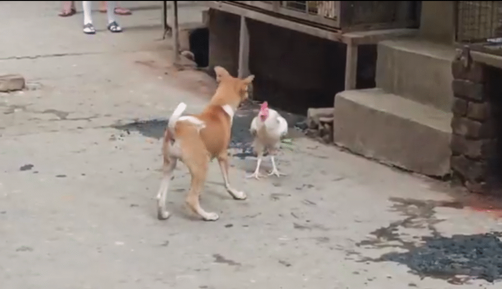 बच्चों से लेकर बुजुर्गों तक सब हैरान थे कि एक छोटा सा मुर्गा कुत्ते को कैसे पछाड़ रहा है। आखिरकार मुर्गे के लगातार वार से परेशान होकर कुत्ता मैदान छोड़ भाग खड़ा हुआ।