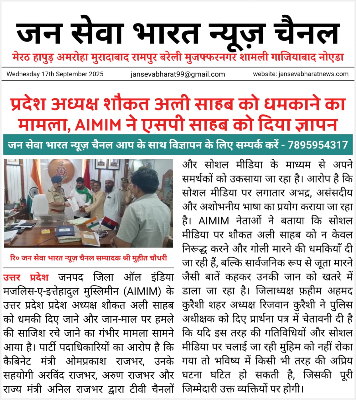 ऑल इंडिया मजलिस-ए-इत्तेहादुल मुस्लिमीन (AIMIM) के उत्तर प्रदेश प्रदेश अध्यक्ष शौकत अली साहब को धमकी दिए जाने और जान-माल पर हमले की साजिश रचे जाने का गंभीर मामला सामने आया है।