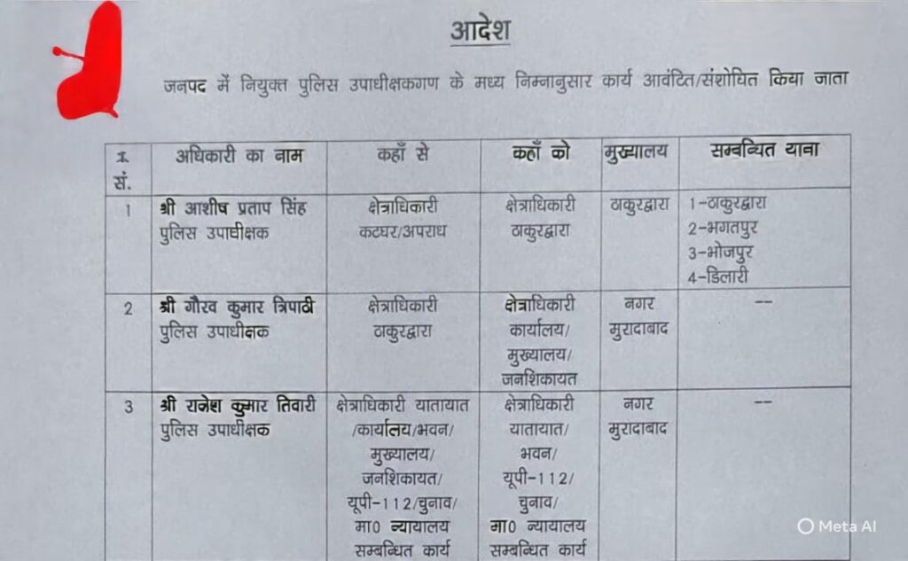 ठाकुरद्वारा सर्किल से हटाए गए डिप्टी एसपी गौरव त्रिपाठी ।मुरादाबाद के SSP सतपाल अंतिल ने क्राइम कंट्रोलमें नाकाम ठाकुरद्वारा सर्किल के सीओ गौरव त्रिपाठीसे सर्किल छीनकर उन्हें पुलिस ऑफिस से अटैच करदिया है। डिप्टी एसपी गौरव को लेकर लगातार शिकायतें.सामने आ रही थीं।इसके अलावा SSP ने जिले के तीन थाना प्रभारियों केकार्यक्षेत्र में भी बदलाव किया है। ठाकुरद्वारा के SHOजसपाल सिंह ग्वाल को ठाकुरद्वारा से हटाकर इसी पदपर कुंदरकी भेजा गया है। जबकि छजलैट के थानाप्रभारी संजय कुमार पांचाल को ठाकुरद्वारा का SHOबनाकर भेजा गया है। कुंदरकी के थाना प्रभारी प्रदीप.कुमार को अब छजलैट थाने की जिम्मेदारी सौंपी गई है।