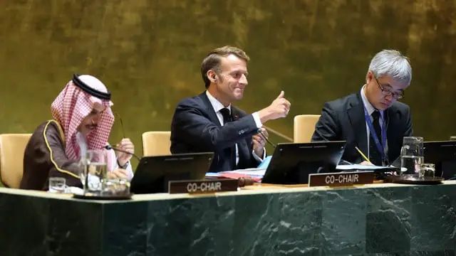 इस बैठक के दौरान फ्रांस के राष्ट्रपति मैक्रों ने ऐतिहासिक रूप से फिलिस्तीनी राष्ट्र को मान्यता देने की घोषणा की। इसके पहले रविवार को ब्रिटेन, कनाडा और ऑस्ट्रेलिया जैसे प्रमुख देश भी फिलिस्तीन को मान्यता दे चुके हैं। बैठक के दौरान फ्रांसीसी राष्ट्रपति मैक्रों ने कहा, “हमें द्वि-राष्ट्र समाधान की संभावना को बनाए रखने के कलिए अपनी पूरी शक्ति से प्रयास करना चाहिए। ताकि इजरायल और फिलिस्तीनी लोगों के जीवन में शांति और सुरक्षा आ सके।” मैक्रों के इस बयान का हॉल में मौजूद लोगों ने जोरदार ताली बजाकर स्वागत किया।