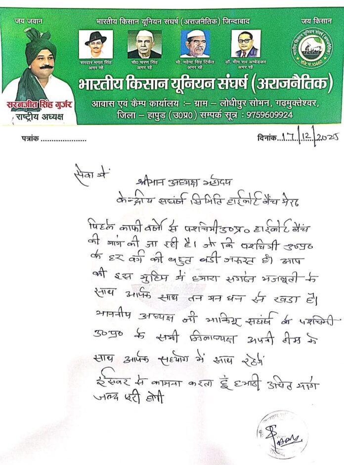 भाकियू संघर्ष (अ) के राष्ट्रीय अध्यक्ष सरनजीत सिंह गुर्जर ने पश्चिमी उत्तर प्रदेश हाईकोर्ट बेंच की स्थापना को लेकर दिया समर्थन