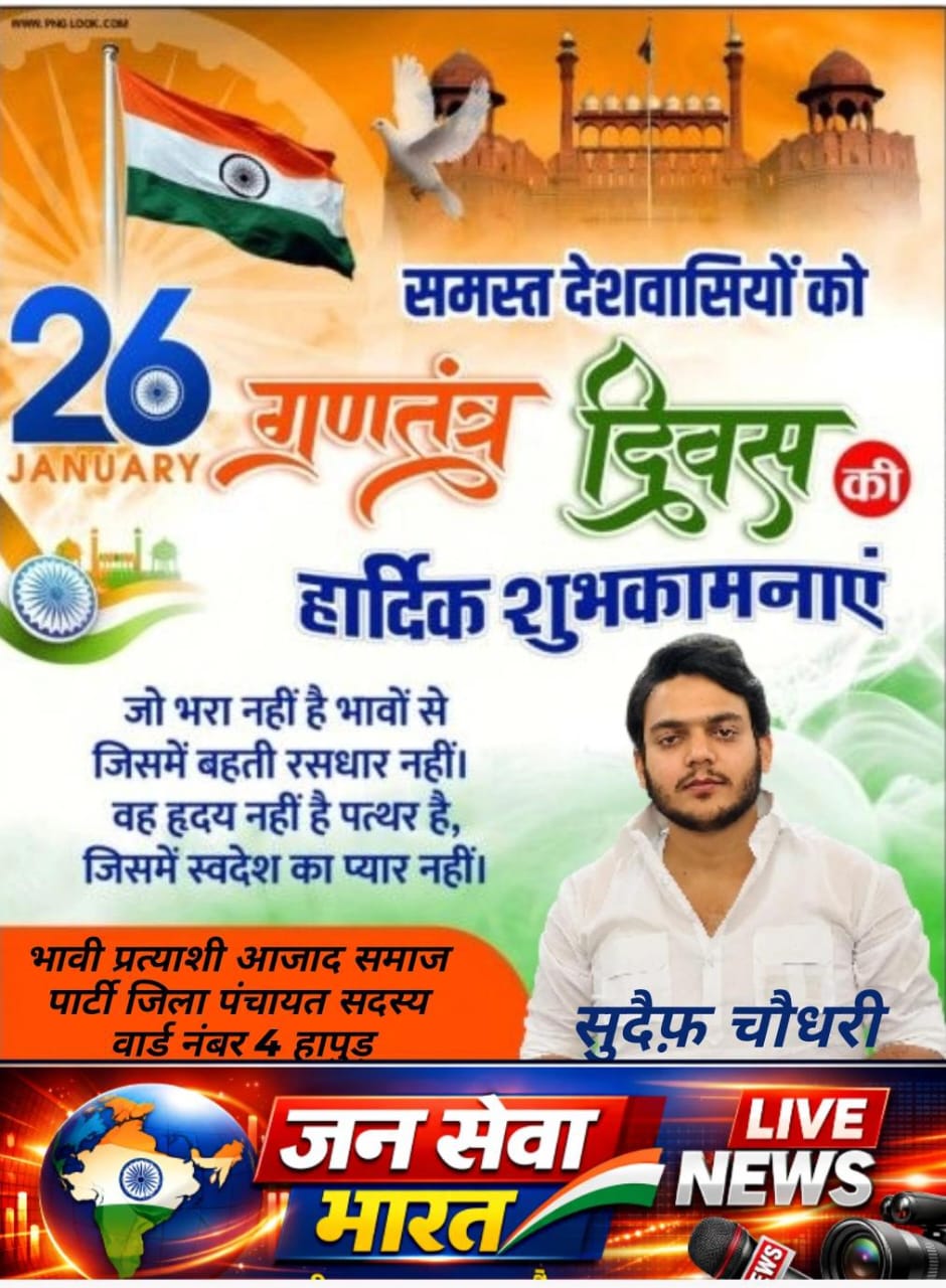 HomeBlogसुदैफ़ चौधरी भावी प्रत्याशी जिला पंचायत सदस्य असपा वार्ड नं 4 की... Blog सुदैफ़ चौधरी भावी प्रत्याशी जिला पंचायत सदस्य असपा वार्ड नं 4 की तरफ से सभी क्षेत्र वासियों को गणतंत्र दिवस की हार्दिक शुभकामनाएं By Saleem 25 January 2026 0 20 Share FacebookTwitterPinterestWhatsApp Share FacebookTwitterPinterestWhatsApp Previous articleसुधीर चौहान राष्ट्रीय प्रवक्ता समाजवादी पार्टी विधान सभा 60 गढ़मुक्तेश्वर की तरफ से सभी क्षेत्र वासियों को गणतंत्र दिवस की हार्दिक शुभकामनाएंNext articleसमाजवादी पार्टी ने मतदाता दिवस पर मतदाताओं को किया जागरूक Saleem RELATED ARTICLES Blog उत्तर प्रदेश के मुरादाबाद थाना भोजपुर.नाबालिग लड़की को बहला-फुसलाकर भगाने.का प्रयास पुलिस ने आरोपी को.किया गिरफ्तार, पॉक्सो एक्ट भी लगा 11 February 2026 Blog उत्तर प्रदेश के मुरादाबाद थाना भोजपुर पुलिस ने तीन आरोपी गिरफ्तार.किए: शांति व्यवस्था भंग करने के आरोप में.न्यायालय में पेश 10 February 2026 Blog उत्तर प्रदेश के मुरादाबाद ठाकुरद्वारा में कांवड़ियों के जत्थे हरिद्वार केलिए रवाना: ‘हर हर महादेव’ के जयकारों सेगूंजा क्षेत्र 10 February 2026 LEAVE A REPLY Cancel reply Comment: Please enter your comment! Name:* Please enter your name here Email:* You have entered an incorrect email address! Please enter your email address here Website: Save my name, email, and website in this browser for the next time I comment. - Advertisment - - Advertisment - Most Popular उत्तर प्रदेश के मुरादाबाद थाना भोजपुर.नाबालिग लड़की को बहला-फुसलाकर भगाने.का प्रयास पुलिस ने आरोपी को.किया गिरफ्तार, पॉक्सो एक्ट भी लगा उत्तर प्रदेश के मुरादाबाद थाना भोजपुर पुलिस ने तीन आरोपी गिरफ्तार.किए: शांति व्यवस्था भंग करने के आरोप में.न्यायालय में पेश उत्तर प्रदेश के मुरादाबाद ठाकुरद्वारा में कांवड़ियों के जत्थे हरिद्वार केलिए रवाना: ‘हर हर महादेव’ के जयकारों सेगूंजा क्षेत्र पूर्व मंत्री मदन चौहान पर बदमाशों द्वारा हमला अति निंदनीय:सपा प्रवक्ता सुधीर चौहान Load more