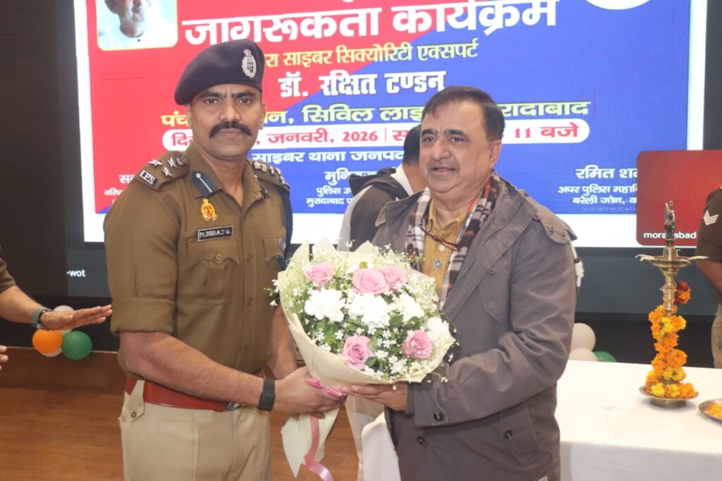 मुरादाबाद में 27 जनवरी 2026 को साइबर सुरक्षाविशेषज्ञ डॉ. रक्षित टंडन द्वारा एक साइबर कार्यशालाऔर जागरूकता कार्यक्रम आयोजित किया गया। इसकार्यक्रम का उद्घाटन पुलिस उपमहानिरीक्षक, मुरादाबादपरिक्षेत्र और वरिष्ठ पुलिस अधीक्षक, मुरादाबाद ने दीपप्रज्ज्वलित कर किया।पंचायत भवन में आयोजित इस कार्यक्रम में पुलिसअधीक्षक नगर, पुलिस अधीक्षक ग्रामीण सहित कईअन्य पुलिस अधिकारी उपस्थित रहे। इस दौरान.उपस्थित श्रोताओं को साइबर अपराधों के विभिन्नप्रकारों और उनसे बचाव के उपायों के बारे में विस्तृत.जानकारी दी गई।