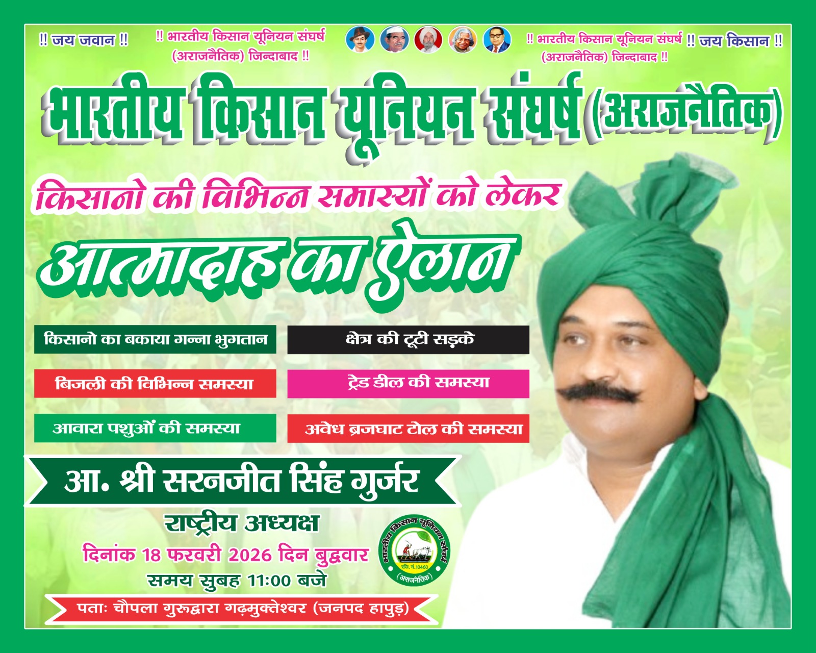 भारतीय किसान यूनियन संघर्ष अ के राष्ट्रीय अध्यक्ष सरनजीत सिंह गुर्जर कल करेंगे आत्मदाह